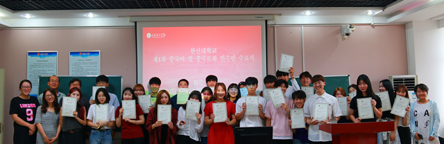 7月9日下午,学校第四期韩信大学“汉语与中国文化”研修班结业仪式在求实楼509教室举行。韩信大学研修班全体师生及学校国际交流合作处负责人、研修班中方班主任、授课教师代表及中方志愿者代表参加了结业仪式。