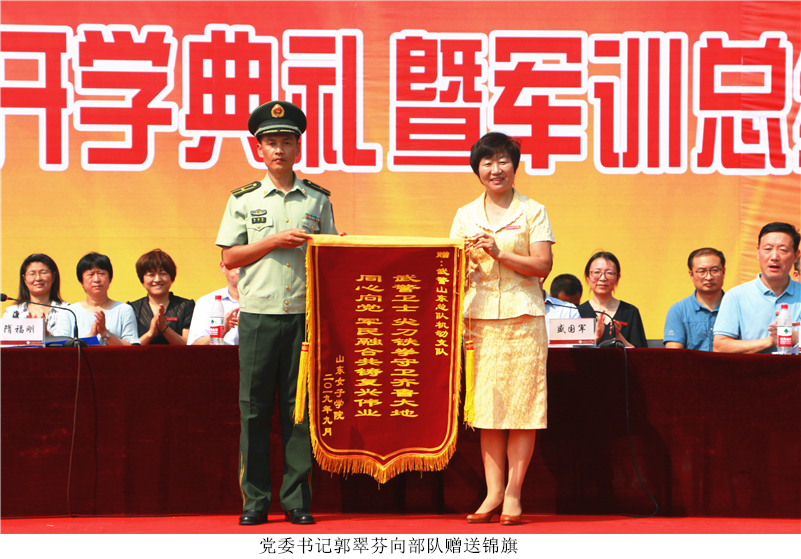 党委书记郭翠芬代表学校向承训部队武警山东总队机动支队赠送锦旗,赞誉“武警卫士 尖刀铁拳守卫齐鲁大地,同心向党 军民融合共铸复兴伟业”。