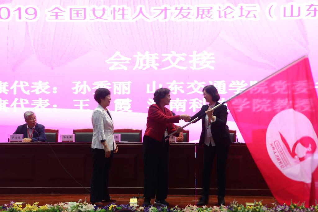 闭幕式上,在徐佩莉的见证下,山东分会代表将中国人力资源开发研究会女性人才研究会会旗交接给河南分会代表。重庆市女性人才研究会会长邹小平做了总结讲话,她提出今后中国女性人才研究会要创新体制机制,围绕国家和地方政府的工作重心,主动积极地承接有关精准扶贫、“一带一路”、民间外交、大数据等和女性人才等具有前瞻性、创新性的课题研究,求真务实,积极主动地服务于女性人才的发展和社会经济的发展。最后,论坛在《歌唱祖国》的嘹亮歌声中圆满结束。