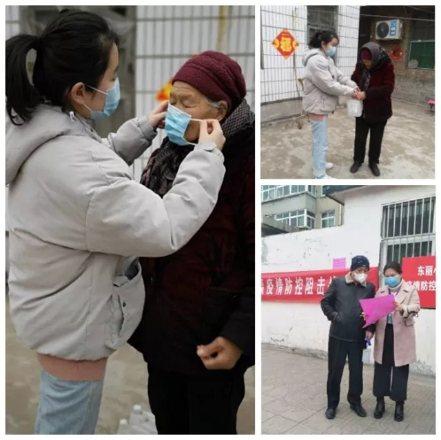会计学院学生党员郑路遥、胡倩茹、李鑫鑫、管爱洁、王璐瑶、纪亚奇、于舒萌积极关注孤寡老人等弱势群体,主动为其讲解防控知识,做好居家隔离,及时为老人们送去口罩、消毒液等物品告知如何使用,主动为其清理卫生,做好消毒。
