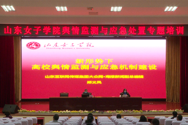 3月31日上午,学校在图书馆第二报告厅举办舆情监测与应急处置专题培训,特邀山东互联网传媒集团大众网?海报新闻副总编辑郑义风作了题为《新形势下高校舆情监测与应急机制建设》的专题报告。校党委副书记王淑霞出席并主持了报告会。学校舆情应急处置专家团队成员、网络舆情信息员和媒体工作人员等参加了培训。