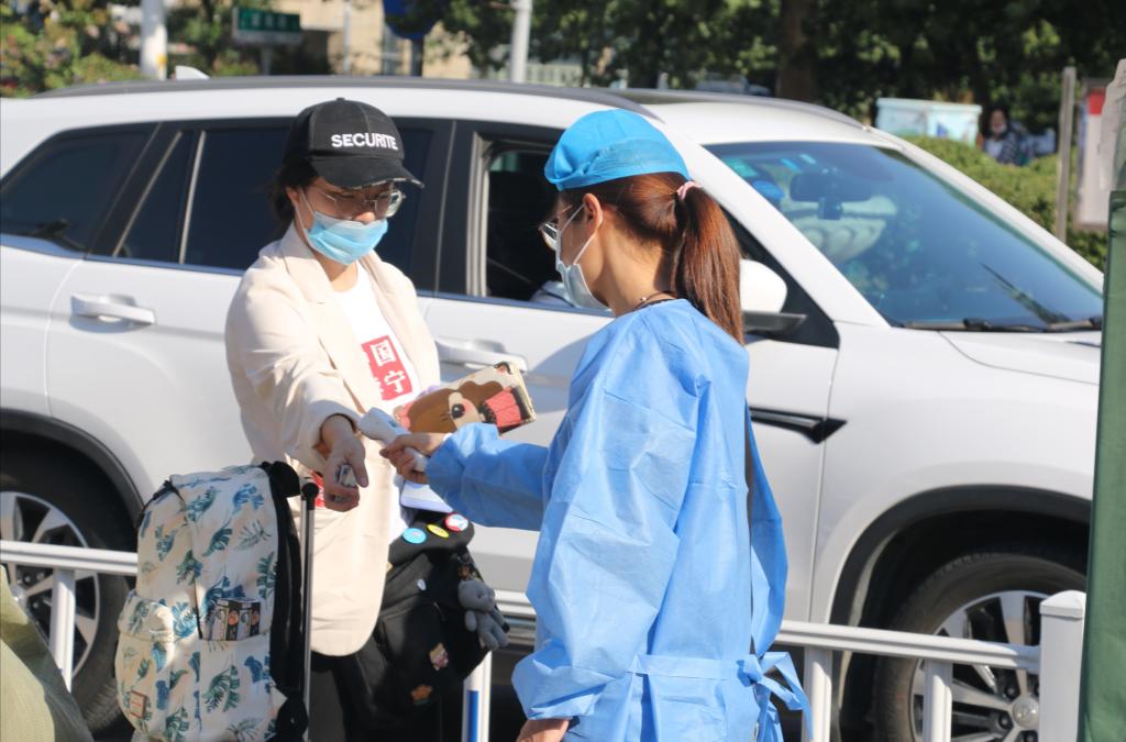 学生间隔排队,检测体温、核验身份、行李消杀、手部清洁……,同学们在老师们的引导下,严格按照疫情防控步骤与要求有序进入校园。