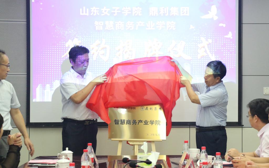 盛国军与曲京鹏共同为“智慧商务产业学院”揭牌。侯素美与鼎利教育山东公司总经理潘新建分别代表校企双方签署战略合作协议。