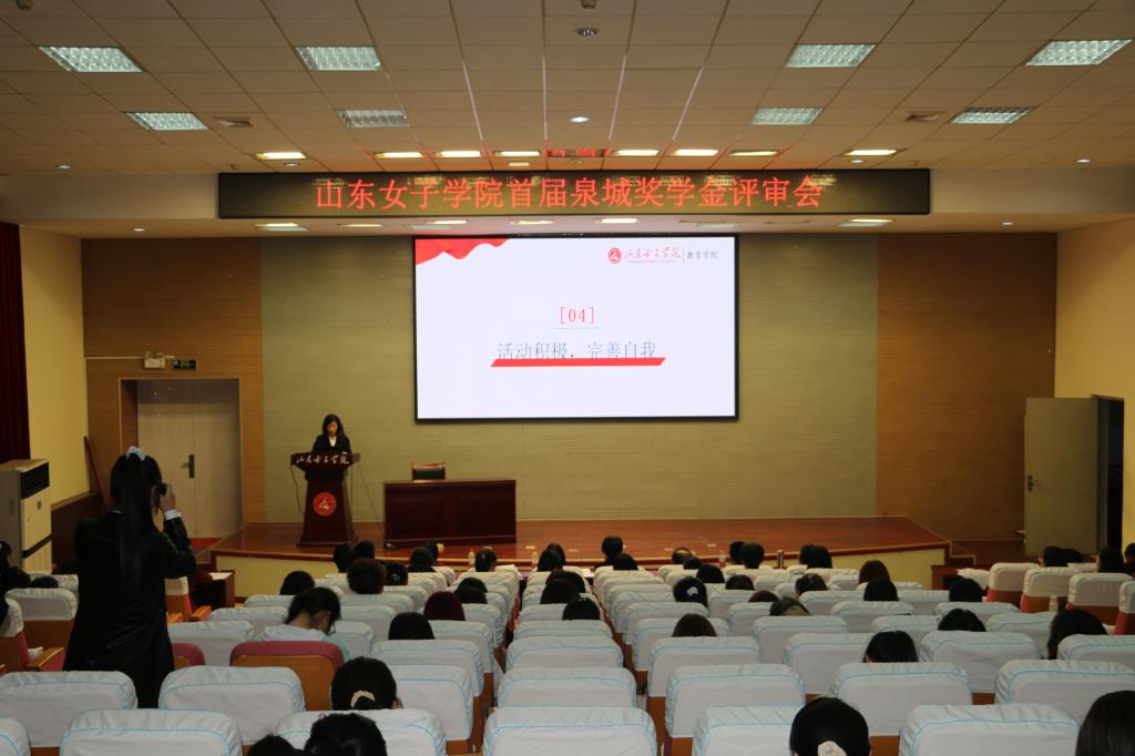 10月8日下午,学校在图书馆一楼报告厅举行了首届泉城奖学金评审会。本次评审会由学校学生工作委员会成员担任评委,学生工作委员会副主任、副校长侯素美,学生处等相关部门负责同志和二级学院分管书记参加了此次活动,200多名学生现场观摩。
