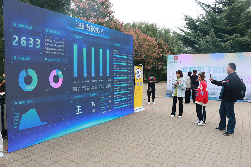为方便新生快捷办理报到手续,学校引入了“智慧迎新”系统。实现“一码报到”的同时,各部门还可实时、全面地掌握迎新各环节的办理进度。报到现场大屏实时更新新生报到数据信息,包括报到人数、来各自省市的学生比例、男女生比例等新生大数据,内容详细又具有趣味性,吸引许多学生和家长驻足观看,合影留念。