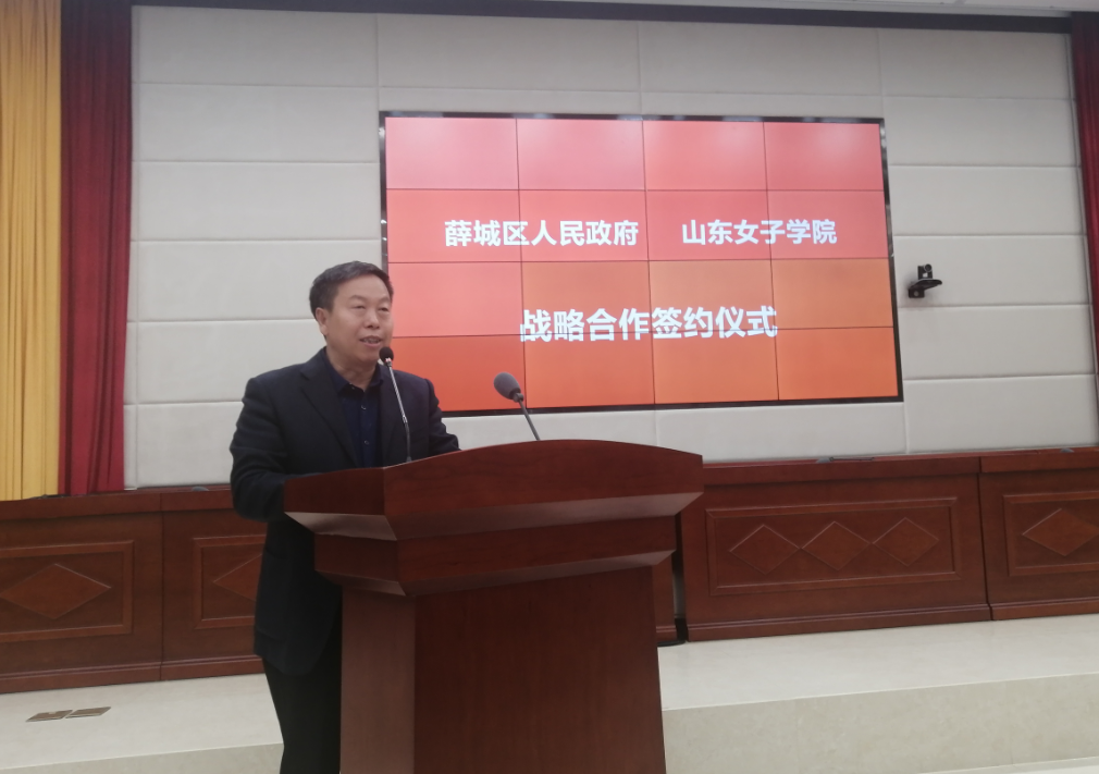 仪式上,盛国军向大家介绍了学校的发展历程,以及近几年取得的成绩,同时,也对薛城区人民政府给予学校的支持表示感谢。盛校长表示,加强校地合作是充分发挥高等院校和地方政府各自优势的有效途径,是推进人才科技资源开放共享、促进产学研深度融合的有力举措,对推动区域经济社会发展具有重要的现实意义。此次战略合作,对我校进一步加快服务地方社会经济发展,促进学校学科建设,将起到积极的推动作用。