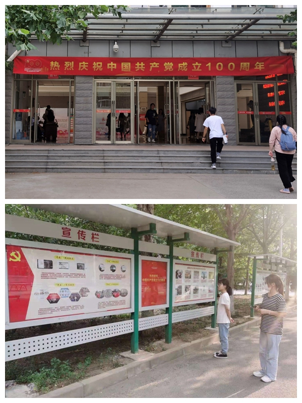 在学校南门,树立起“热烈庆祝中国共产党成立100周年”大幅喷绘展板和旗帜;在各楼宇,设置宣传展板、横幅,电子屏播放标语;在图书馆大厅,大屏幕滚动播放彩色宣传图片;在宣传长廊,各宣传栏更换为崭新的庆祝建党100周年宣传内容。
