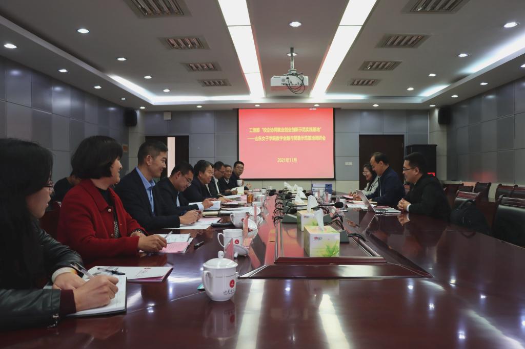 11月4日,工信部校企协同就业创业创新示范实践基地项目办负责人张德一行三人针对“校企协同就业创业创新示范实践基地”(数字金融与贸易)项目来校调研,党委副书记、院长盛国军,华仁教育发展有限公司(山东文旅投资集团)总经理张俊建,学校人事处、招就处、科研处、教务处、经济学院负责人参加调研。