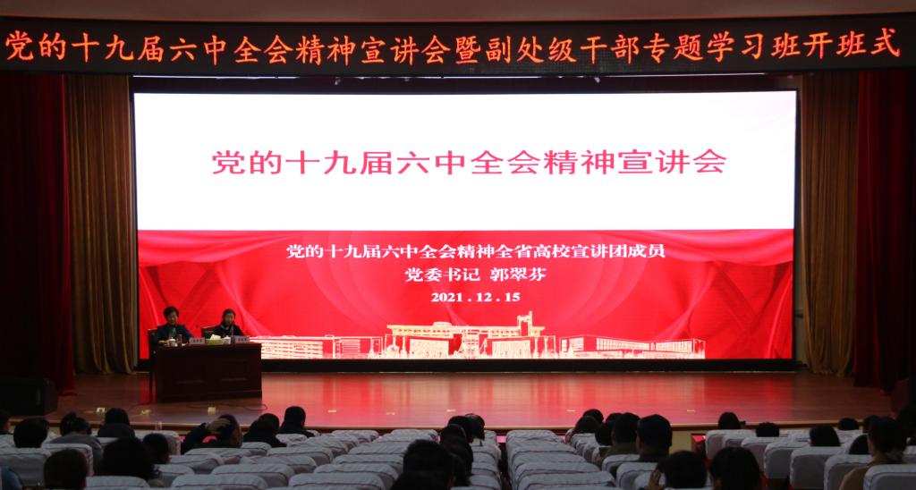 12月15日下午,学校举行党的十九届六中全会精神宣讲会暨副处级干部专题学习班开班式,党的十九届六中全会精神全省高校宣讲团成员、学校党委书记郭翠芬为师生作宣讲报告。学校科级以上干部、思想政治理论课教师、辅导员和学生代表聆听宣讲报告。宣讲会由纪委书记黄晓彦主持。