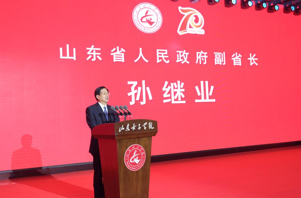 孙继业代表省政府向山东女子学院七十周年校庆表示热烈祝贺。他说,山东女子学院伴随着新中国前进的步伐而诞生,伴随着改革开放的进程而发展。七十年来,一代代女院人秉承“坤德含弘、至善尚美”的校训,勤奋耕耘,弦歌不辍,奋力推动学校向应用型地方特色名校的目标迈进。特别是近年来,学校认真贯彻落实党的教育方针,坚持社会主义办学方向,紧紧围绕立德树人根本任务,锚定“走在前、开新局”,在人才培养、科学研究、社会服务、文化传承等方面深化改革、锐意进取,育人成效显著,办学成果丰硕,为经济强省发展作出了重要贡献。希望学校立足建校七十周年新起点,坚持以习近平新时代中国特色社会主义思想为指导,把深入学习贯彻党的二十大精神作为当前和今后一个时期的首要政治任务,全面贯彻落实党的教育方针,突出女性人才培养特色,持续强化学科建设,坚定不移走内涵式高质量发展道路,加快提升人才培养质量和办学水平,早日建成特色鲜明的高水平应用型大学。希望女院学子牢记习近平总书记“怀抱梦想又脚踏实地,敢想敢为又善作善成”的谆谆教诲,坚定不移听党话、跟党走,努力在新时代的青春赛道上跑出无愧于时代、无愧于人民、无愧于历史的好成绩。