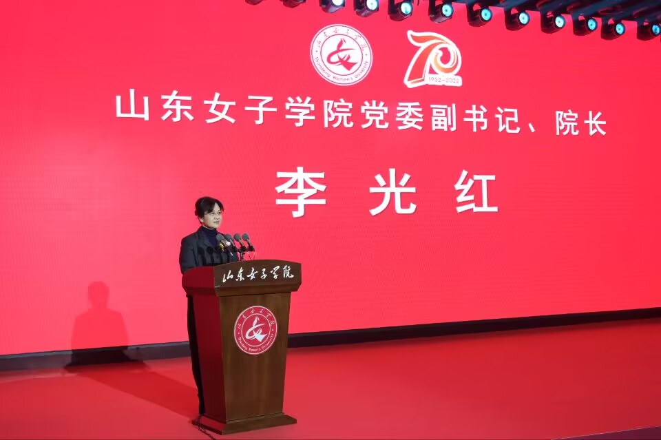 党委副书记、校长李光红在致辞中向全体师生员工和广大校友致以节日的祝贺,向长期以来关心、支持和帮助学校建设与发展的各级领导和社会各界朋友表示衷心的感谢。她从历史回顾、办学成就、展望未来三个方面,回顾总结了学校七十年来的成长历程、发展成就,提出了未来的奋斗目标。她指出,学校历经妇联干部培训、联合举办成人高等学历教育、独立举办成人高等学历教育、专科教育、本科教育5个时期,主动融入山东省经济社会和妇女儿童事业及高等教育发展进程,办学层次实现了一次又一次新跨越,办学规模实现了一次又一次新突破,办学质量实现了一次又一次新跃升,现已成为山东省应用型本科高校建设支持单位,不断书写女性高等教育发展新篇章。七十年来,学校坚持学科引领、人才为先,坚定不移走高质量发展之路;坚持为党育人、为国育才,坚定不移走匠心育人之路;坚持特色发展、彰显优势,坚定不移走差异化办学之路;坚持薪火接续、开放包容,坚定不移走文化传承之路。这些都离不开老一辈创业者、教职员工和广大校友的奋斗,凝聚着党和政府的关心和重视,凝聚着社会各界的支持和帮助。她号召女院人不忘初心使命,砥砺奋斗前行,面向未来,主动回应党和人民新期待,努力培养德智体美劳全面发展的社会主义建设者和接班人;不断开创高质量发展新局面,提升科技创新和社会服务能力;加快建设高水平女子大学新征程,始终与国家经济社会发展同向、与高等教育事业发展同行、与世界妇女进步事业发展同步,在建设特色鲜明的高水平女子大学的航程中奋楫扬帆、再启新程。