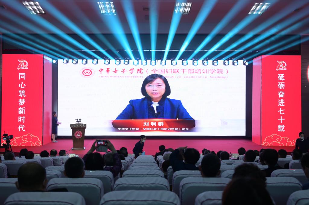 大会现场播放了国内外友好学校的祝贺视频。中华女子学院党委副书记、院长刘利群代表中华女子学院、全国妇联干部培训学院和中国女子高等院校联盟,向学校全体师生员工和广大校友致以热烈的祝贺和诚挚的祝福,高度赞赏学校七十年来取得的成就,祝愿山东女子学院继续谱写与时代同行、与妇女事业共进的壮美新篇章。