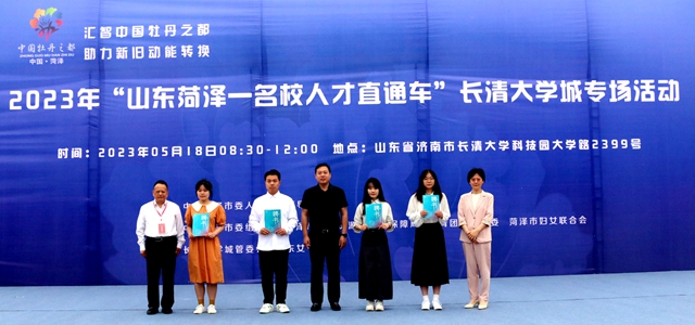 为贯彻落实党中央、国务院“稳就业”“保就业”决策部署及省委组织部、省人力资源和社会保障厅明升体育:“全链条引才、推动青年人才集聚”的工作要求,5月18日上午,“山东菏泽—名校人才直通车”长清大学城专场招聘会在学校巾帼广场举行。副校长刘恩允,菏泽市人力资源和社会保障局党组成员、市返乡创业服务中心主任李迁,共青团菏泽市委书记林永敬、长清大学城管委会副主任陈晓勇以及山东师范大学、山东中医药大学、山东齐鲁工业大学(山东省科学院)等9所高校就业负责人参加了活动启动仪式。启动仪式由菏泽市妇联党组成员、副主席李荷玲同志主持。