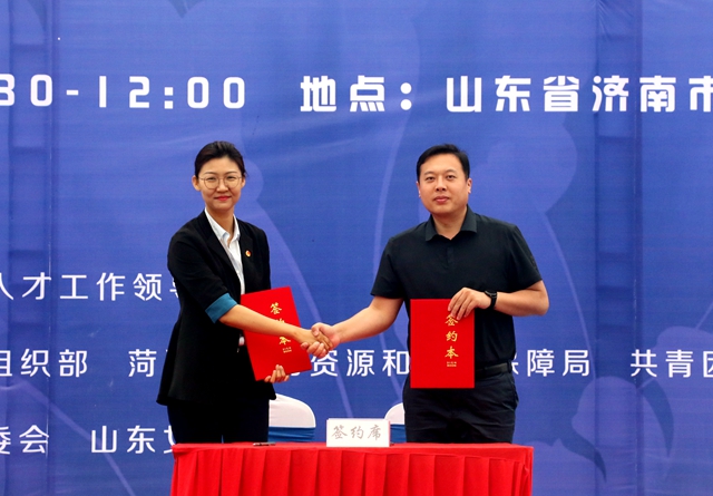 刘恩允代表大学城高校师生表达了对参会嘉宾和企业的欢迎,发出了加强校企校地合作的倡议。陈晓勇作出了进一步为驻地各高校服务社会做好牵线搭桥的承诺。李迁介绍了近些年来菏泽市的经济社会发展情况及招才引智优惠政策,向青年才俊发出了邀约。共青团菏泽市委与山东女子学院团委签署校地共青团合作协议,菏泽市人社局、菏泽团市委相关负责人为菏泽驻山东女子学院青鸟驿站颁发聘书。