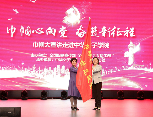 活动最后,吕晓黎从中华女子学院党委书记、院长刘利群手中接过“巾帼榜样走进女校思政课”旗帜,下一站活动将在山东女子学院举行。