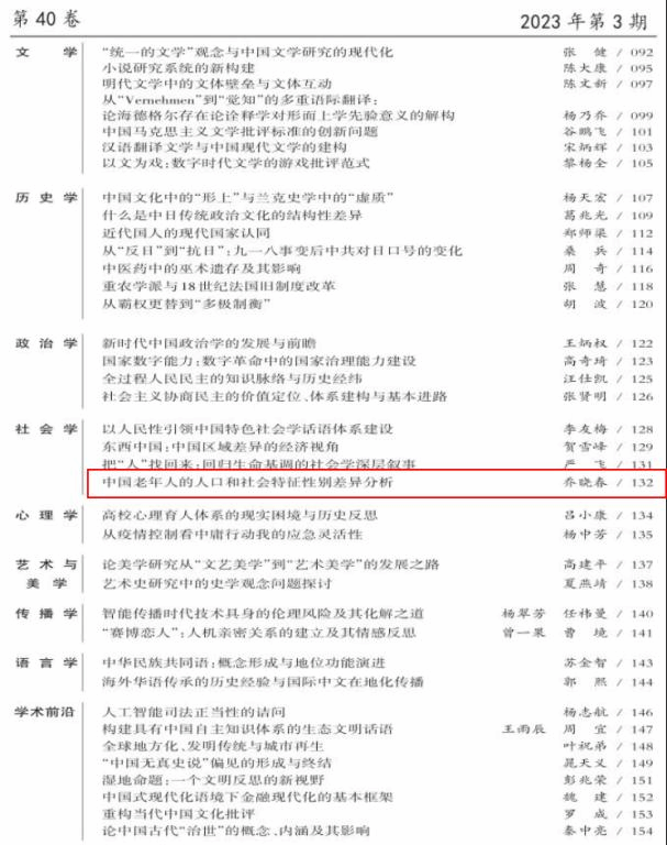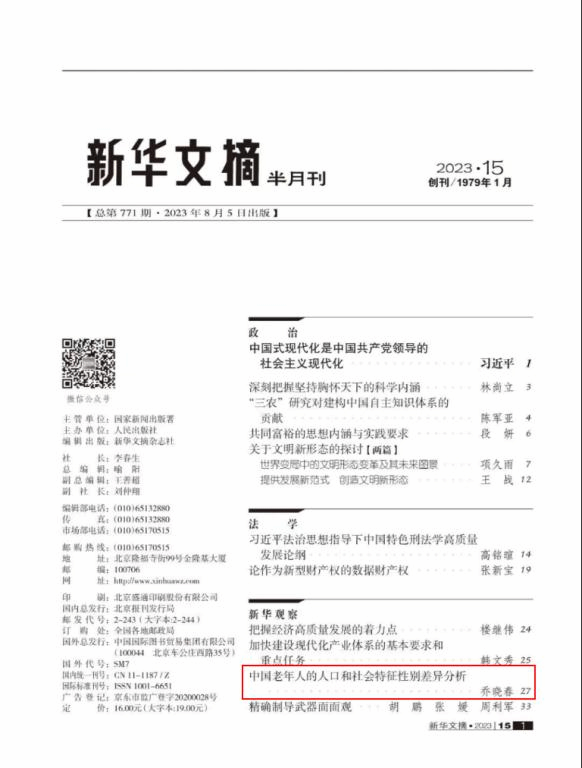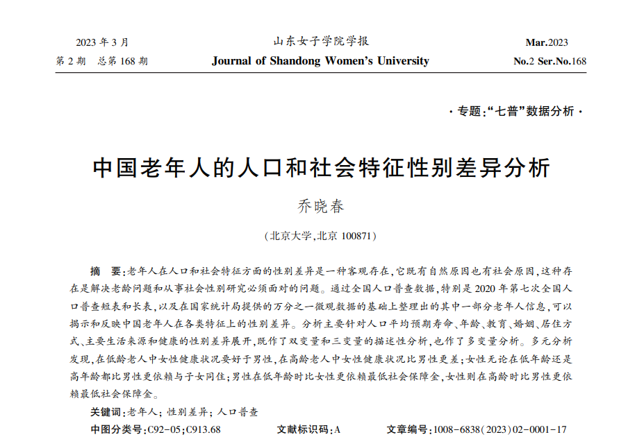 近日,《山东女子学院学报》2023年第2期刊发的北京大学教授乔晓春的文章《中国老年人的人口和社会特征性别差异分析》被《新华文摘》2023年第15期、《高等学校文科学术文摘》2023年第3期和人大复印报刊资料《妇女研究》2023年第4期全文转载。以下为文章摘要及转载期刊目录。