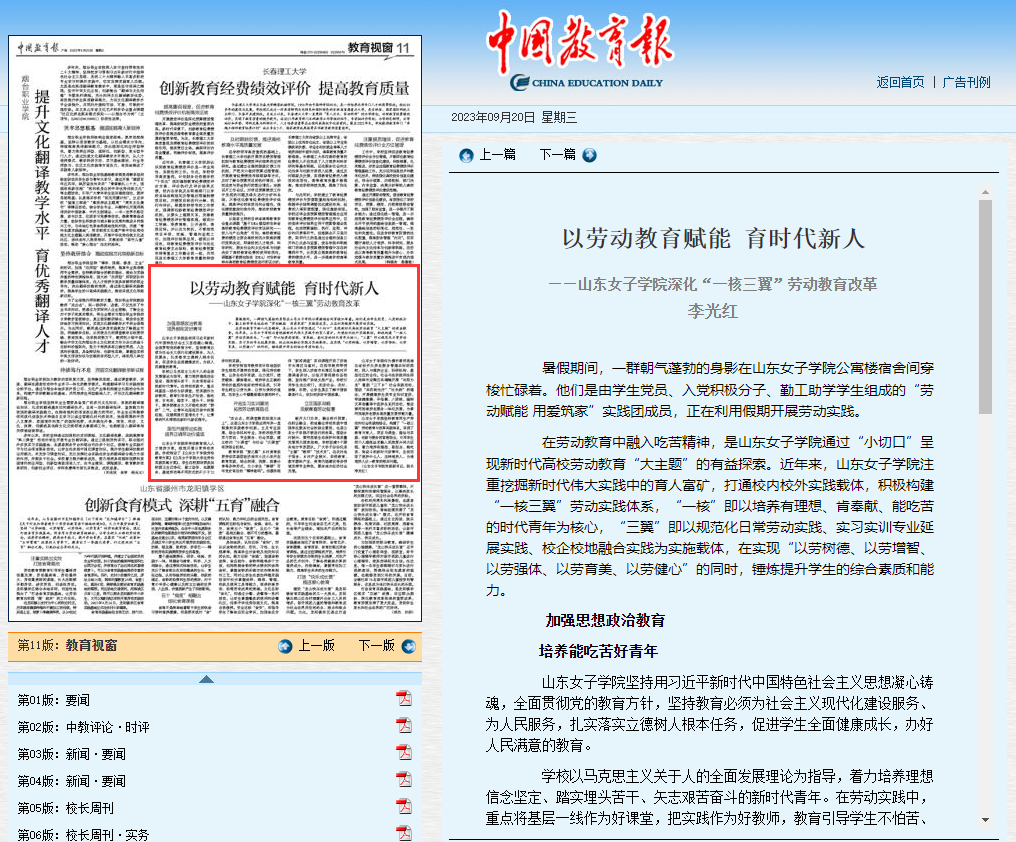 加强新时代劳动教育是全面贯彻落实党的教育方针的基本要求,是办好人民满意教育的重要内容,是加快建设高质量教育体系、建成教育强国的重要举措。9月20日,《中国教育报》刊发了校长李光红文章:《以劳动教育赋能育时代新人——山东女子学院深化“一核三翼”劳动教育改革》,报道了学校劳动教育改革实践探索。