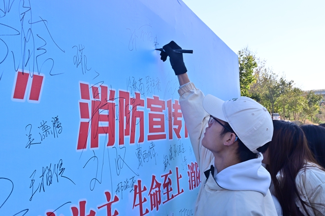 活动现场,还开展了参观消防知识展板、消防宣传月签名、校园安全文创产品和消防违禁物品实物展、消防帐篷逃生演练、灭火器使用、防暴恐盾牌操、消防版广播体操、水带接驳连贯动作等系列活动,“零距离”接触专业消防器材、了解消防安全知识。