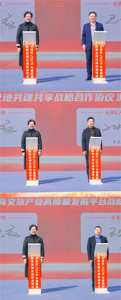 吕晓黎、董泽勇为16家重点企业授予“校地校企融合发展突出贡献企业”奖牌。李光红与长清区人社局、教体局、文旅局现场签订战略合作协议。