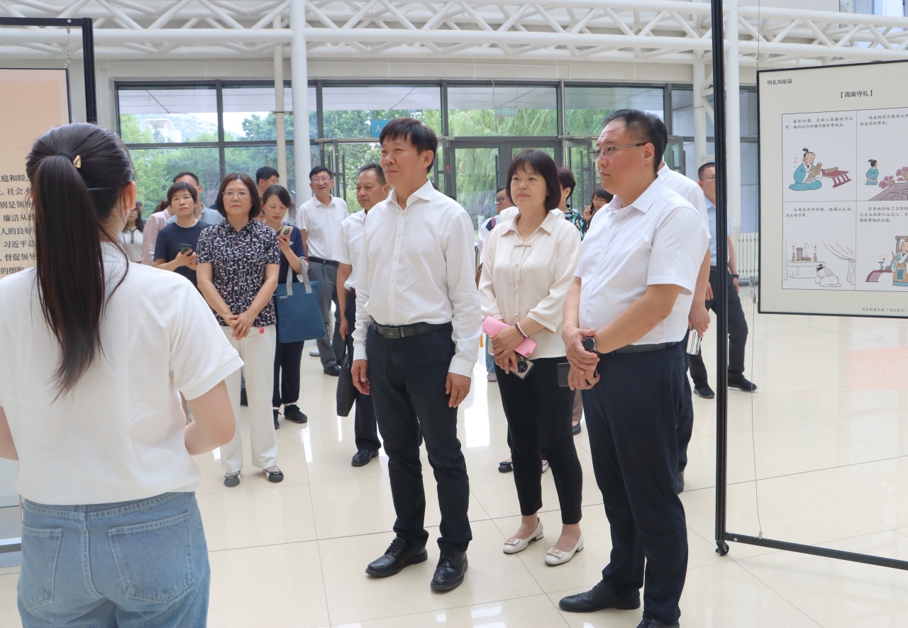 启动仪式结束后,大家在讲解员的引领下观展。本次漫说家风展共展出图片146余张、家风故事110余个,分为和谐关系、教子有道、孝慈齐家、明礼知耻、崇德尚廉、爱国敬业六大篇章,以大众喜闻乐见的漫画形式解读家庭、家教、家风,引导党员干部以史为鉴,以德正身,做清廉家风的传承者、践行者、示范者。