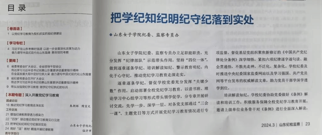 习近平总书记在二十届中央纪委三次全会上发表重要讲话强调,以学习贯彻新修订的纪律处分条例为契机,在全党开展一次集中性纪律教育。开展党纪学习教育是以习近平同志为核心的党中央作出的重大决策部署,是今年党建工作的重点任务。山东女子学院纪委、监察专员办立足职能职责,充分发挥“纪律部队”示范带头作用,坚持“四位一体”,做到逐章逐条学纪、培训解读知纪、警示教育明纪、内化于心守纪,推动党纪学习教育走深走实。相关经验做法被《山东纪检监察》(2024年第3期)刊发推广。