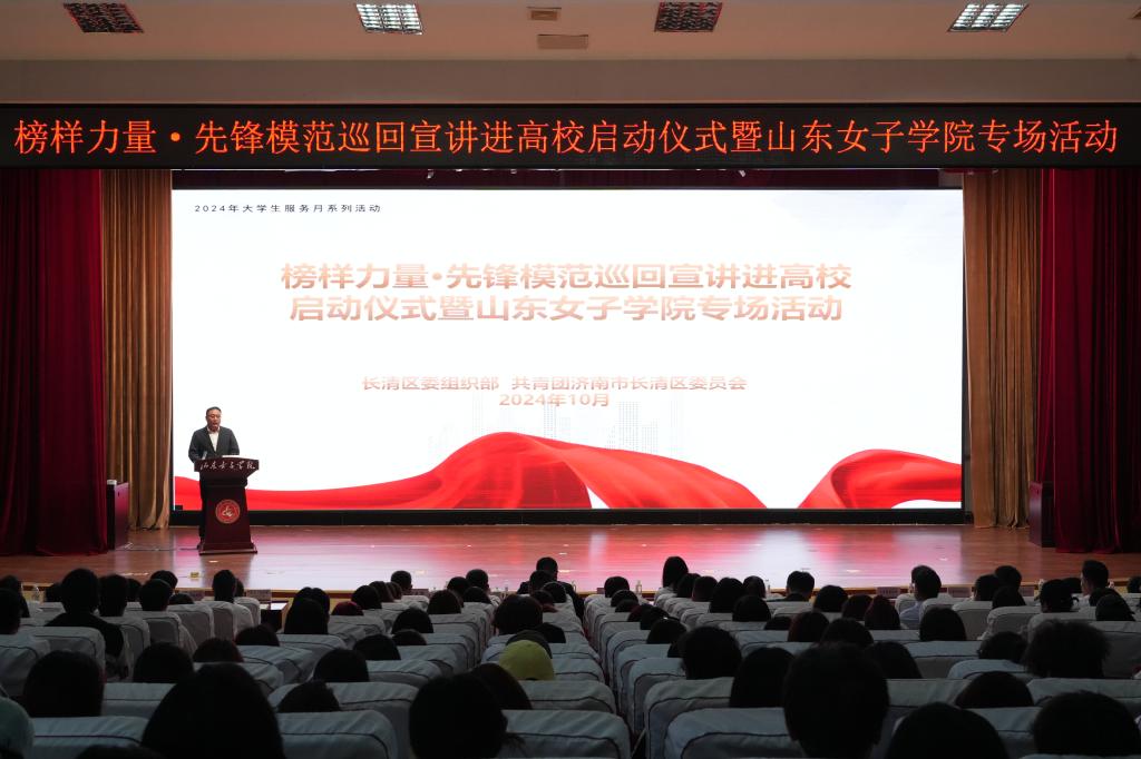 10月11日下午,长清区2024年大学生服务月系列活动之“榜样力量·先锋模范巡回宣讲进高校”启动仪式暨山东女子学院专场活动在图书馆二楼报告厅顺利举行。学校党委副书记龙希利,长清区委组织部副部长付勐,长清区委组织部副部长、市委党校组织人事部副部长李晓林,大学城管委会高校联络部副部长刘秀军以及驻区各高校团委相关负责人,长清区委组织部、团区委、大学城管委会高校联络服务部有关工作人员参加,学校优秀师生代表聆听宣讲。