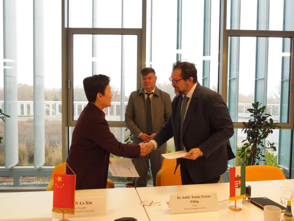 在纽曼·亚诺什?学,访问团与该校主席Dr. Tamás Fül?p、校长Dr. Zoltán Nagy,副校长Dr. Norberta Sági等进行了座谈交流。田立新首先转达了学校党委书记对一同参加第十一届“世界大学女校长论坛”的Norberta Sage副校长的亲切问候,随后介绍了学校学科专业建设、人才培养模式等方面的情况。在前期充分交流的基础上,双方签署了合作谅解备忘录,就教师交流、学生留学、合作研究、文化交流等方面开展合作达成初步意向。