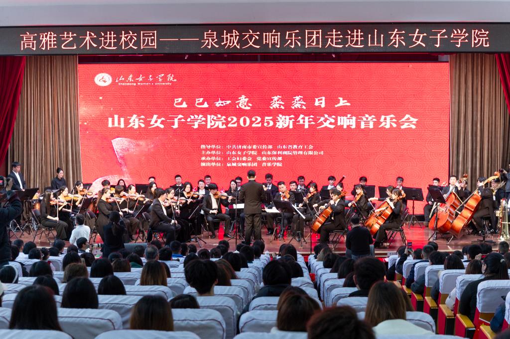 此次音乐会由中共济南市委宣传部、山东省教育工会指导,山东女子学院、山东保利剧院管理有限公司主办。音乐会紧紧围绕“高雅艺术进校园—泉城交响乐团走进高校”这一主题,用合奏、齐奏、独奏、声乐等多元形式展现了高雅艺术。《阿拉贡》《赛吉第亚舞曲》《快乐的女战士》等精彩节目,博得全场师生一阵阵热烈的掌声。
