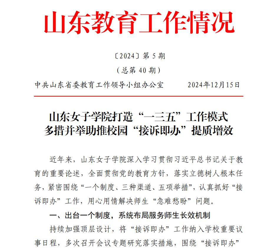 日前,《山东教育工作情况》2024年第五期刊发《山东女子学院打造“一三五”工作模式 多措并举助推校园“接诉即办”提质增效》,文章紧密围绕用心用情解决师生“急难愁盼”问题,不断创新工作举措,通过一项制度引领、畅通三个渠道、实施五项举措,建立健全对师生诉求快速响应、高效办理、及时反馈、主动治理的服务机制,形成以师生诉求驱动学校治理的有效路径。