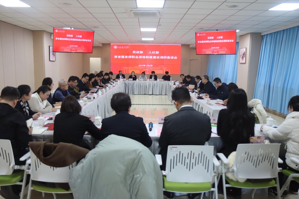 1月8日上午,人力资源和社会保障部专技司副司长刘冬梅、民政部养老服务司副司长李永新一行来校调研学校在养老人才培养方面的实践成果以及养老服务师职业资格制度建设工作,山东省民政厅副厅长王树山出席调研座谈会。山东省人力资源和社会保障厅、民政厅,济南市人力资源和社会保障局、民政局相关负责人,省内知名养老企业负责人参与座谈。学校党委书记吕晓黎、副校长刘恩允接待调研团一行并出席座谈会,学校相关部门、单位负责人以及健康养老学院师生代表参加座谈会。