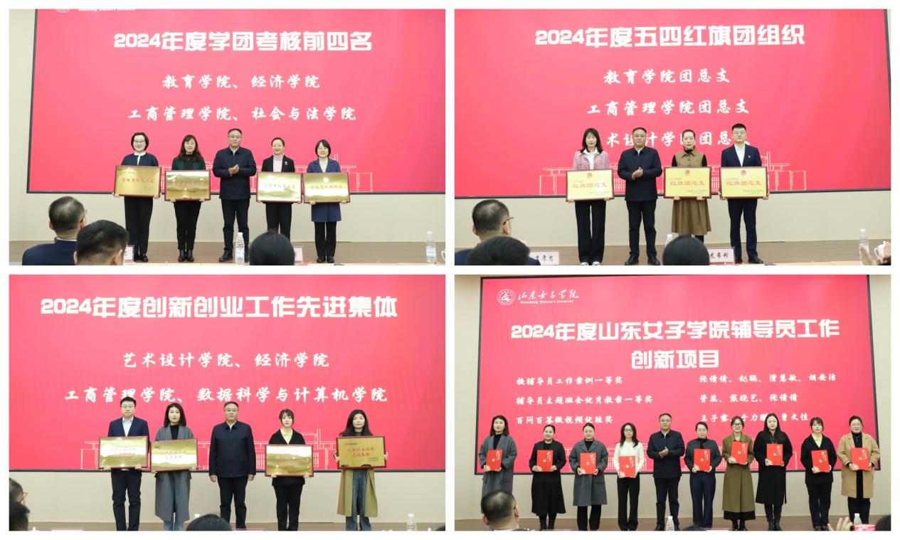 会议对2024年度学团考核前4名学院、五四红旗团组织、创新创业工作先进集体、优秀辅导员、辅导员省级科研立项、辅导员工作创新项目进行了表彰。获奖代表进行了发言。