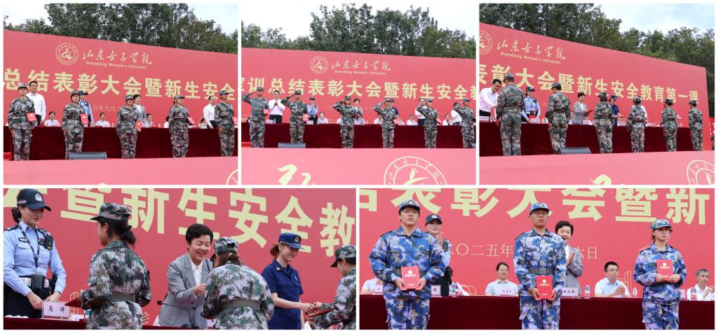 秋阳映场,迷彩列装。9月26日上午,学校2025年新生军训总结表彰大会暨新生入学安全教育第一课在田径场举行。