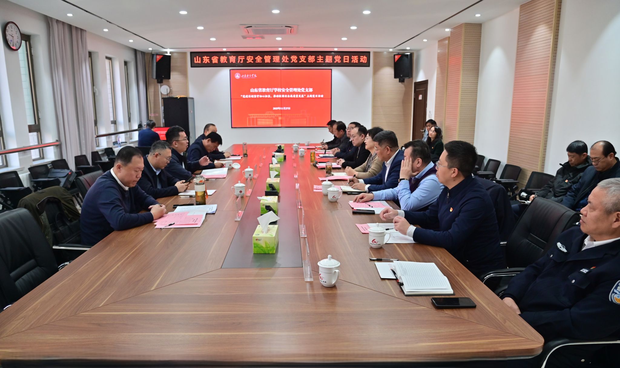 11月27日上午,山东省教育厅学校安全管理处处长石仁勇一行5人来校开展“党建引领坚守初心担当,推动校园安全高质量发展”主题党日活动。学校党委副书记、校长李光红出席活动并讲话,后勤保障党委、学生工作处负责人,驻校高级警长及支部党员代表参会,部分驻长清区高校安全管理处负责人特邀参会。