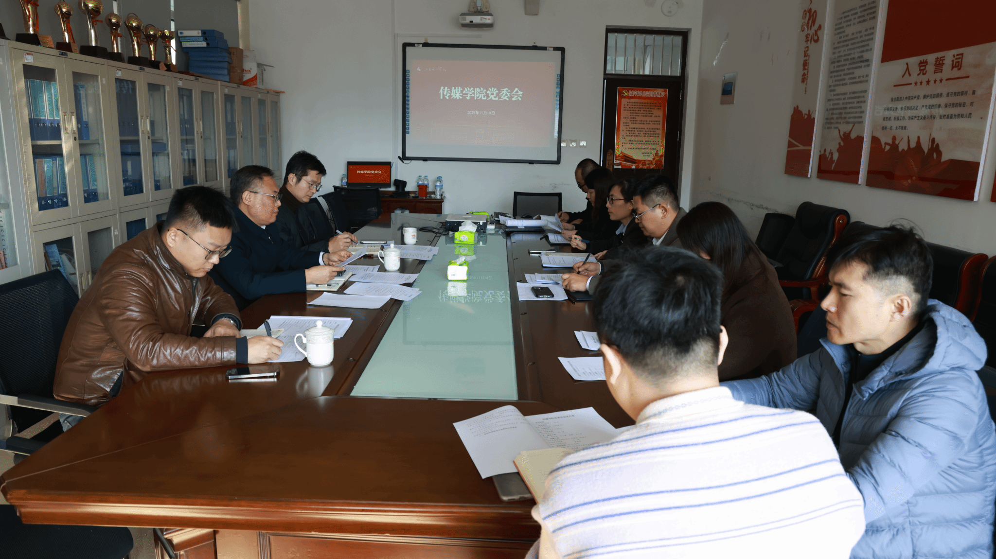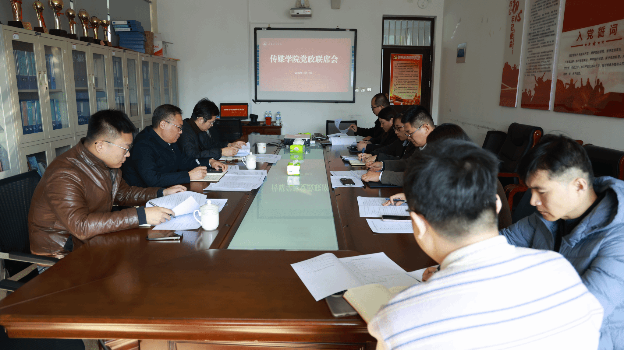 11月19日,传媒学院在求真楼211会议室召开党委理论学习中心组学习会、党委会及党政联席会,学校党委副书记龙希利全程列席指导。学校党委组织部、党委宣传部相关人员陪同列席。学院党委委员及党政领导班子成员参加。