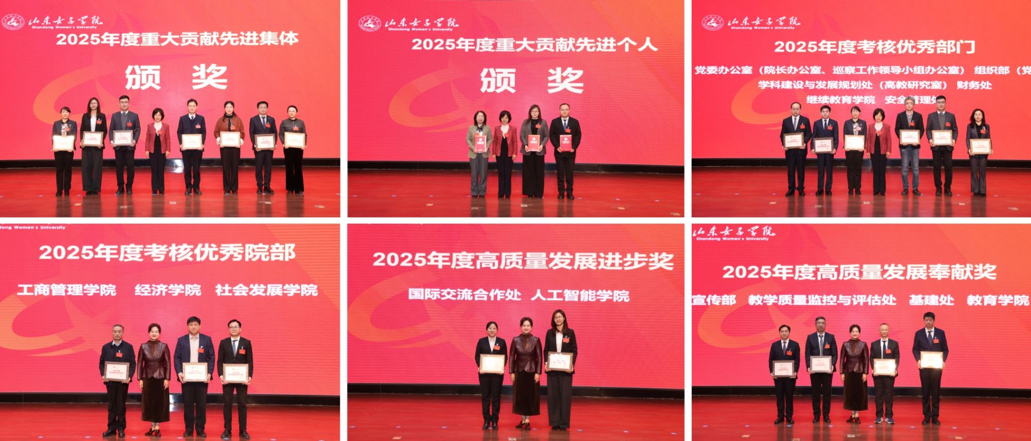 会议对2025年度重大贡献奖先进集体和个人,年度考核优秀的部门和院部,高质量发展进步奖、奉献奖集体进行了表彰。