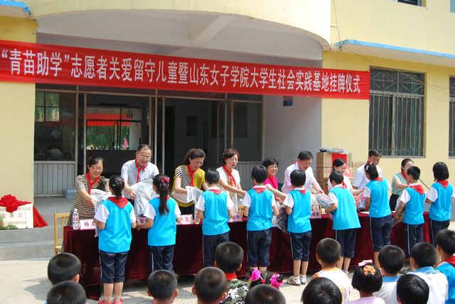 启动仪式上,宿建沛副书记及济阳县领导分别发表讲话,高度评价了此次活动的重要意义。校团委负责人为仁风镇“山东女子学院大学生社会实践基地”揭牌,并在王圈小学正式建立了“‘青苗助学’关爱留守儿童支教点”。同时我校还向王圈小学留守儿童捐赠了液晶电视、课外读物、粉笔、书包等爱心用品。参加支教活动的大学生志愿者代表与留守儿童结对交换“爱心卡”。