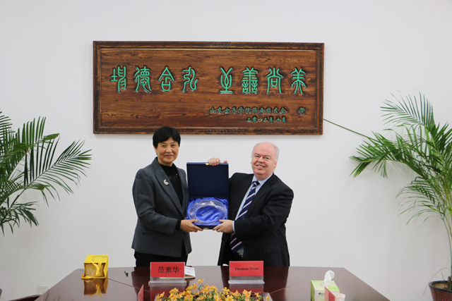 座谈会上,范素华代表学校对爱尔兰塔拉理工学院校长一行的到来表示热烈欢迎,并简要介绍了山东女子学院的发展历史、学科设置、办学特色、教学科研、学生管理及国际交流等方面的基本情况。托马斯·斯通对学校的热情接待表示感谢,也介绍了塔拉理工学院的教学科研等方面的情况。随后,双方就教师培训计划、学生交流项目等具体问题进行了深入的交流。会谈结束后,两校签订合作备忘录。