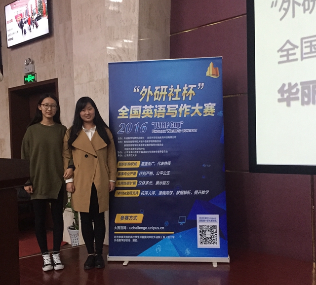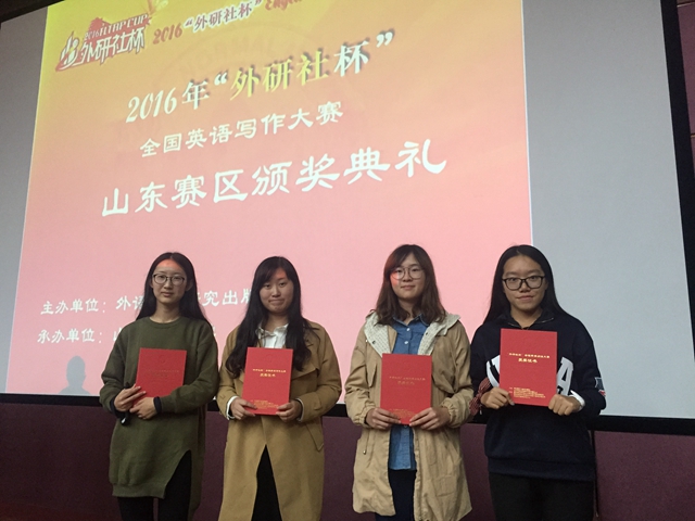 近日,2016“外研社杯”大学生挑战赛之全国英语阅读大赛、写作大赛山东赛区复赛在山东师范大学落下帷幕。我校英语专业李桂琳同学、于跃同学获得写作三等奖,财务管理专业王春晖同学、人力资源管理专业韩晓璇同学获得阅读优胜奖。