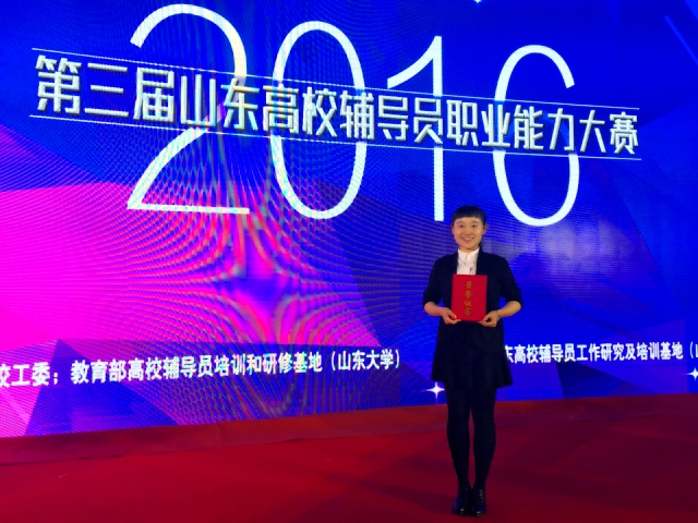2016年12月3-5日,第三届山东高校辅导员职业能力大赛在济南举行。本次活动由中共山东省委高校工委、教育部高校辅导员培训研修基地(山东大学)主办,山东高校辅导员工作研究及培训基地(山东建筑大学)承办。来自全省各高校的126名选手参加了本次大赛,共评出一等奖10个、二等奖20个、三等奖30个,我校文化传播学院辅导员杨晓斐老师荣获大赛二等奖。