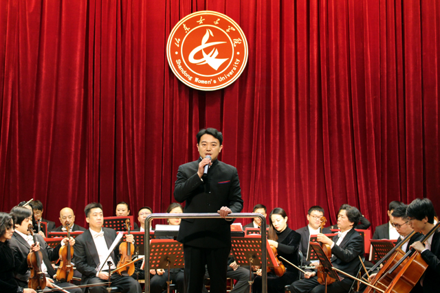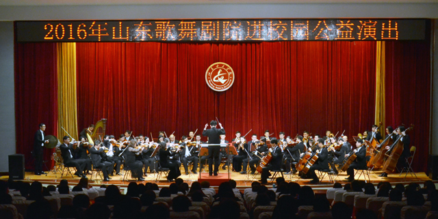 为丰富师生校园文化生活,培养青年学生的艺术素养和健康审美情趣,12月8日晚,2016年度山东歌舞剧院“艺术进校园”公益演出在我校华丽上演。本次活动由山东省委宣传部、山东省文化厅和山东省教育厅主办,来自山东歌舞剧院交响乐团的艺术家们为在场的400余名师生奉献了一场精彩绝伦的艺术盛宴。