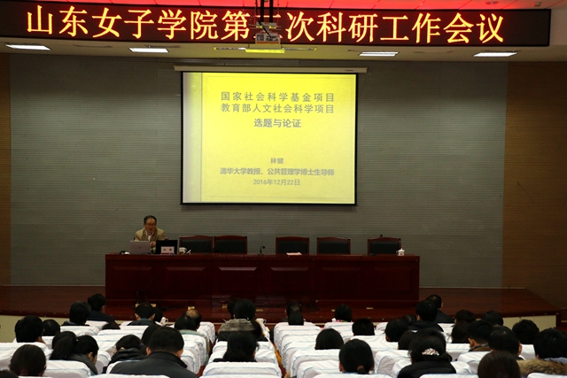 12月22日上午,山东女子学院第三次科研工作会议在图书馆一楼报告厅隆重召开。山东省软科学办公室主任廉荣,山东省社科规划办副主任陈建兵,清华大学博士生导师林健教授,学校党委书记郭翠芬,校长范素华,副校长王淑霞、贺兴利、刘正林等领导出席会议,各部门、单位行政负责人,以及全校具有讲师及以上专业技术职务的人员参加会议,会议由王淑霞主持。会议分两个阶段进行:第一阶段是开幕式;第二阶段由林健教授作《国家社会科学基金-教育部人文社会科学项目选题与论证》的申报辅导报告。