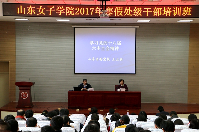 1月9日至10日,学校举办2017年寒假处级干部培训班,专题学习十八届六中全会精神及高等教育综合改革相关文件精神,研究部署2017年工作。山东省教育厅副厅长郭建磊、山东省委党校党史教研部主任王立新教授受邀在培训班上作专题辅导报告。学校领导郭翠芬、范素华、宿建沛、王淑霞、贺兴利、刘正林出席培训会,全体处级干部参加培训会。党委书记郭翠芬、校长范素华、副书记宿建沛分阶段主持培训会。