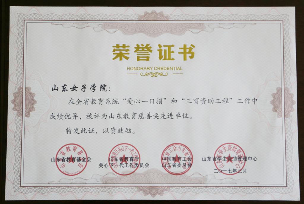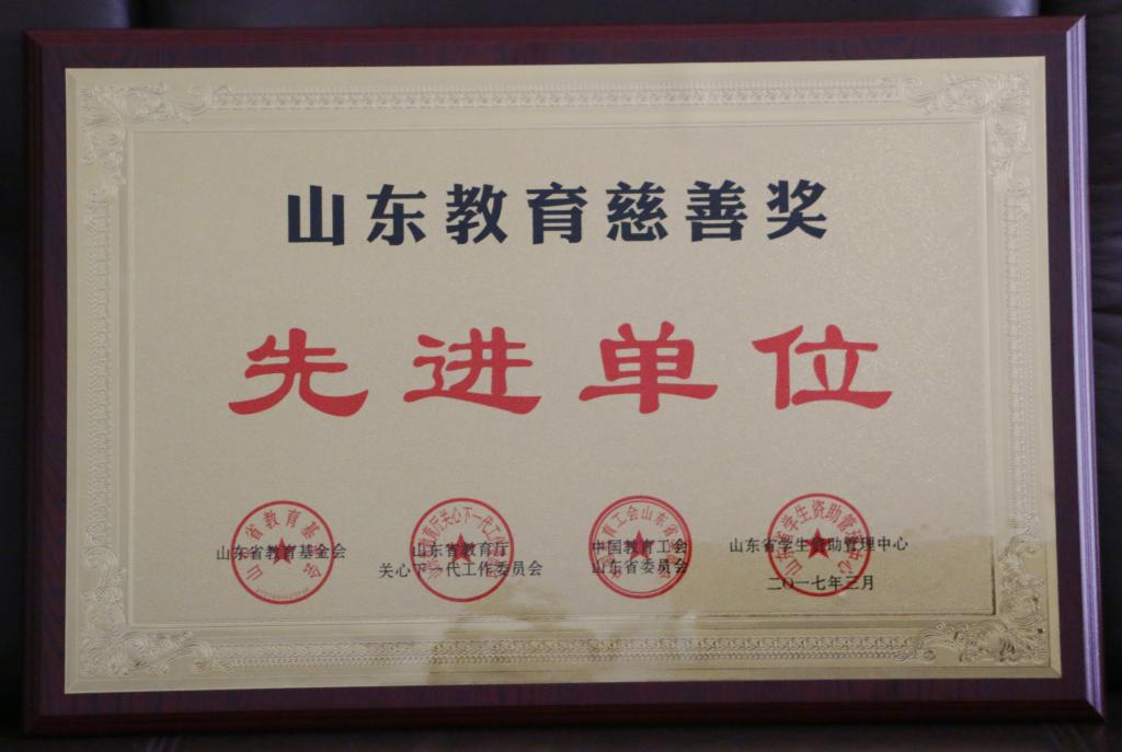 近日,山东省教育基金会、山东省教育厅关心下一代工作委员会、中国教育工会山东省委员会、山东省学生资助管理中心联合下发文件,通报表彰在全省教育系统“爱心一日捐”和“三育资助工程”工作中成绩优异的单位和个人,我校被授予“山东教育慈善奖先进单位”荣获称号。