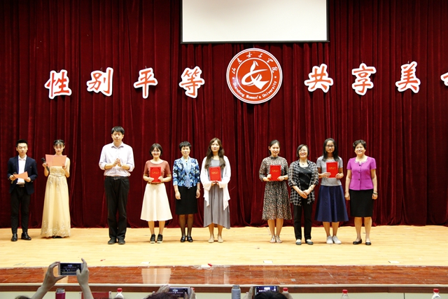 为配合学校“三八”国际妇女节文化宣传月活动,妇女研究所、团委、宣传部共同举办以倡导先进性别文化,共促性别平等为主题的“性别平等,你我同行”征文比赛,颁奖仪式也在本次大会上举行。本次征文比赛共征集来自各学院学生论文101篇,经评委会评审评选出一等奖6人、二等奖9人、三等奖10人、优秀奖10人,以及优秀组织奖2人。与会领导为获奖学生颁奖。