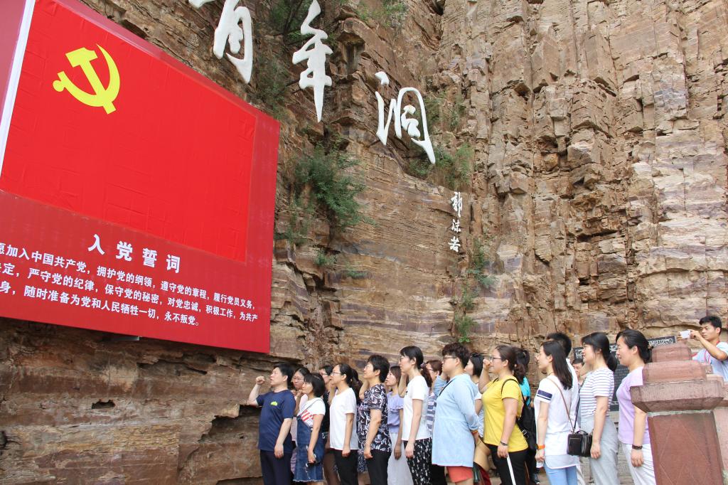 学习的第一站是前往红旗渠开展体验式教学。党员们徒步从红旗渠展区入口登上数百级台阶,翻过险峻的山岭,走过曲折的长堤,来到红旗渠咽喉工程“青年洞”。青年洞从地势险恶、石质坚硬的太行山腰穿过,是红旗渠的最艰险的工程,也是整个水利工程的枢纽。“劈开太行山,漳河穿山来,林县人民多壮志,势把山河重安排。”这大无畏的英雄气概深深震撼了前来参观老师们。在青年洞口,全体党员重温了入党誓词。