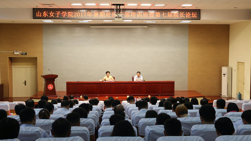 8月28日,学校2017年暑期处级干部培训班暨第七届院长论坛在图书馆一楼报告厅开幕。学校党委书记郭翠芬作培训动员讲话,山东省委高校工委副巡视员刘欣堂应邀为培训班作题为《深入学习全面贯彻落实全国全省高校思想政治工作会议精神》的报告,校长盛国军主持开幕式,副校长王淑霞主持报告会,副校长刘正林解读 《山东女子学院综合改革方案》,副校长贺兴利、纪委书记黄晓彦、副校长侯素美出席会议。学校副处级以上干部参加培训。