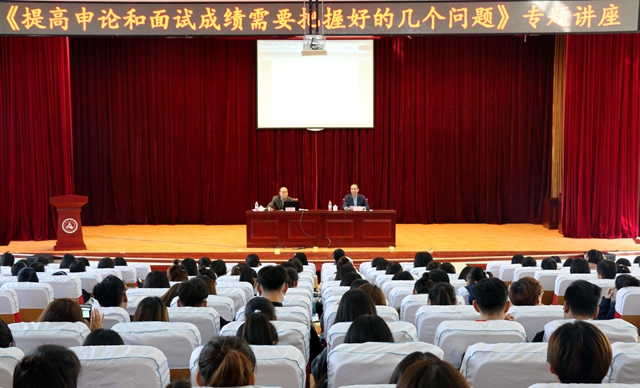 在“精图杯”第二环节专业机构分析讲解模考试卷结束后,学校特邀山东省公职类考试资深专家高德敬主任,为我校学生开展“提高申论和面试成绩需要把握好的几个问题”讲座,讲座主要围绕公职类岗位考试政策解读、考试重点、出题方向、面试及答题技巧等方面展开,高主任的讲座提纲挈领、深入浅出、旁征博引、富于激情、风趣幽默,精彩的讲座赢得场下阵阵热烈的掌声。