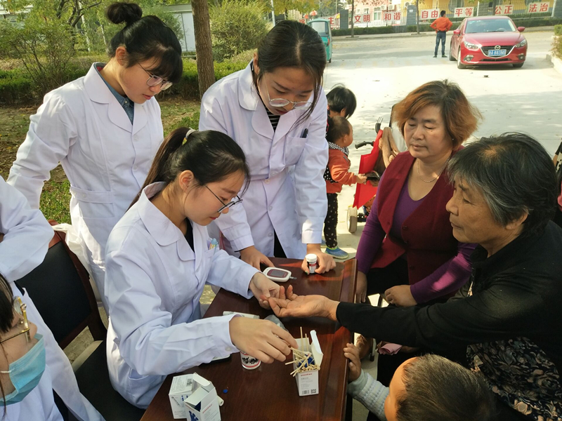 在向老人们普及健康知识的同时,专业教师薛娇美、陈晓云带领同学们为老人们测量血糖血压,发放健康知识传单,并就老人们所关心的健康、心理及营养膳食问题作了耐心细致的解答。