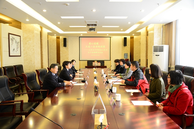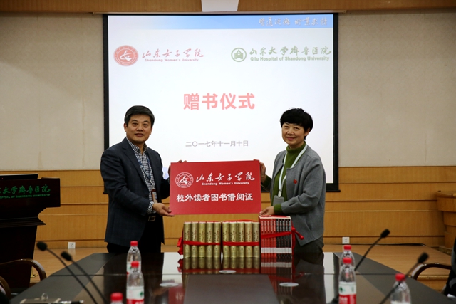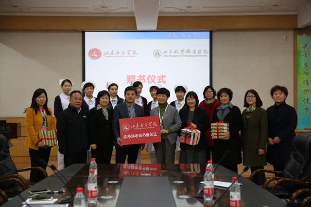 10日下午,我校一行5人又匆匆赶往齐鲁医院,齐鲁医院党委副书记林玉杰、组织部长、工会主席、统战部长、大外科党总支书记、部分支部书记等出席捐赠仪式,林书记代表齐鲁医院对我校爱心送暖的捐赠善举表示感谢。捐赠后,双方进行了交流讨论,初步达成设立“山东女子学院图书馆校外阅读基地”合作意向。