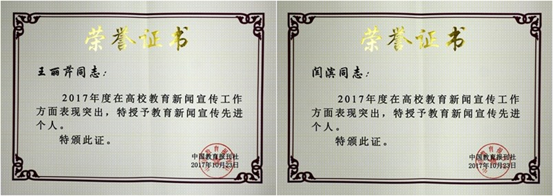 会上,中国教育报刊社表彰了教育新闻宣传先进单位和先进个人,我校被评为中国教育报“2017年度教育新闻宣传先进单位”称号,王丽芹、闫滨被评为“2017年度高校教育新闻宣传先进个人”称号。